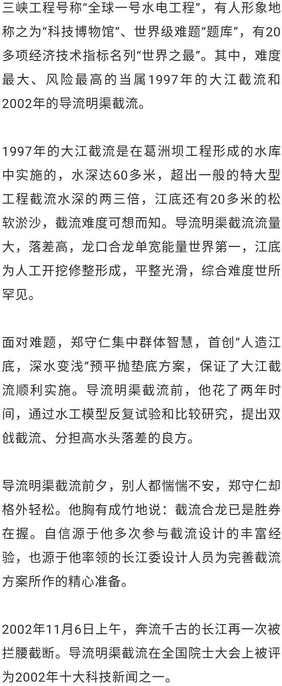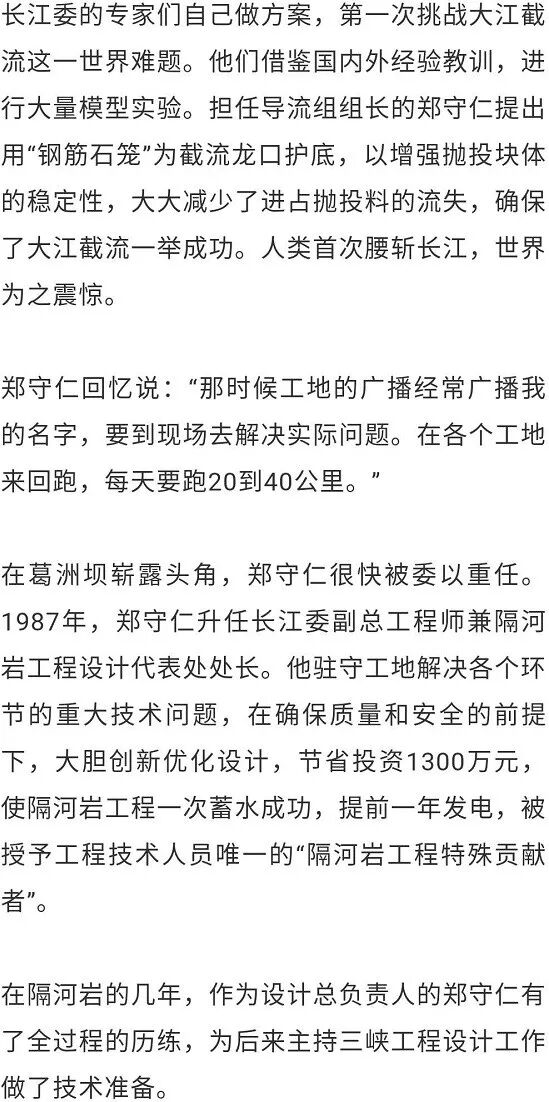 上世纪七八十年代,郑守仁主持了乌江渡、葛洲坝工程导截流设计,创造了多个全国第一。葛洲坝截流时,法国有一家公司提出20万美元做一个大江截流方案,这对于刚刚改革开放、外汇稀少的我国无疑是天文数字。
