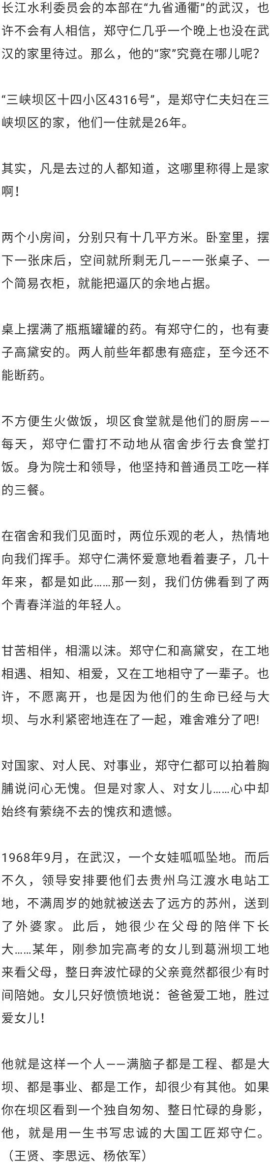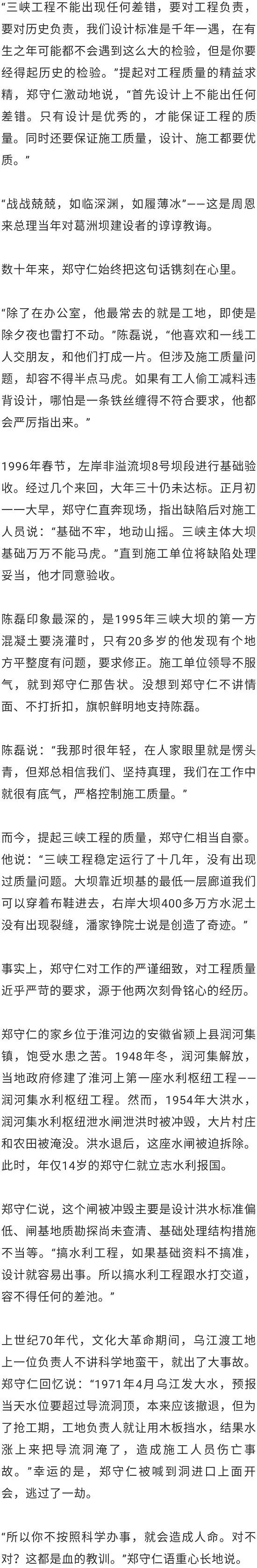 “作为一名水利人,能参与三峡工程是最大的幸福。”郑守仁说,“只要三峡工程需要我一天,我就在这里坚守一天。”