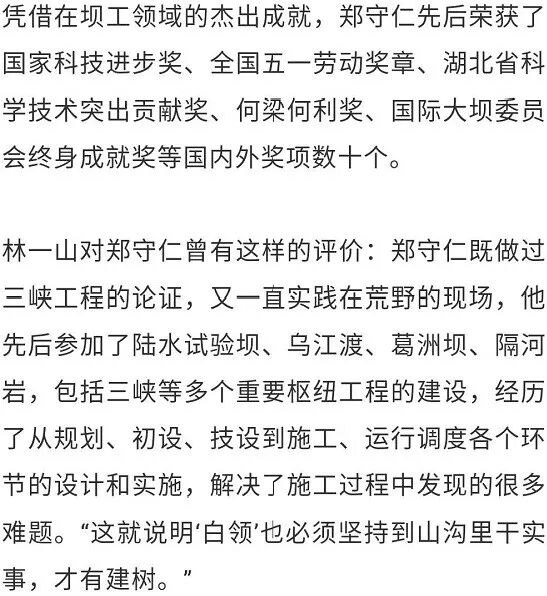 被毛泽东誉为“长江王”的著名水利专家林一山曾找人带信给郑守仁,要他一定把三峡工程的总结做好,只有郑守仁可以把这个总结做好。