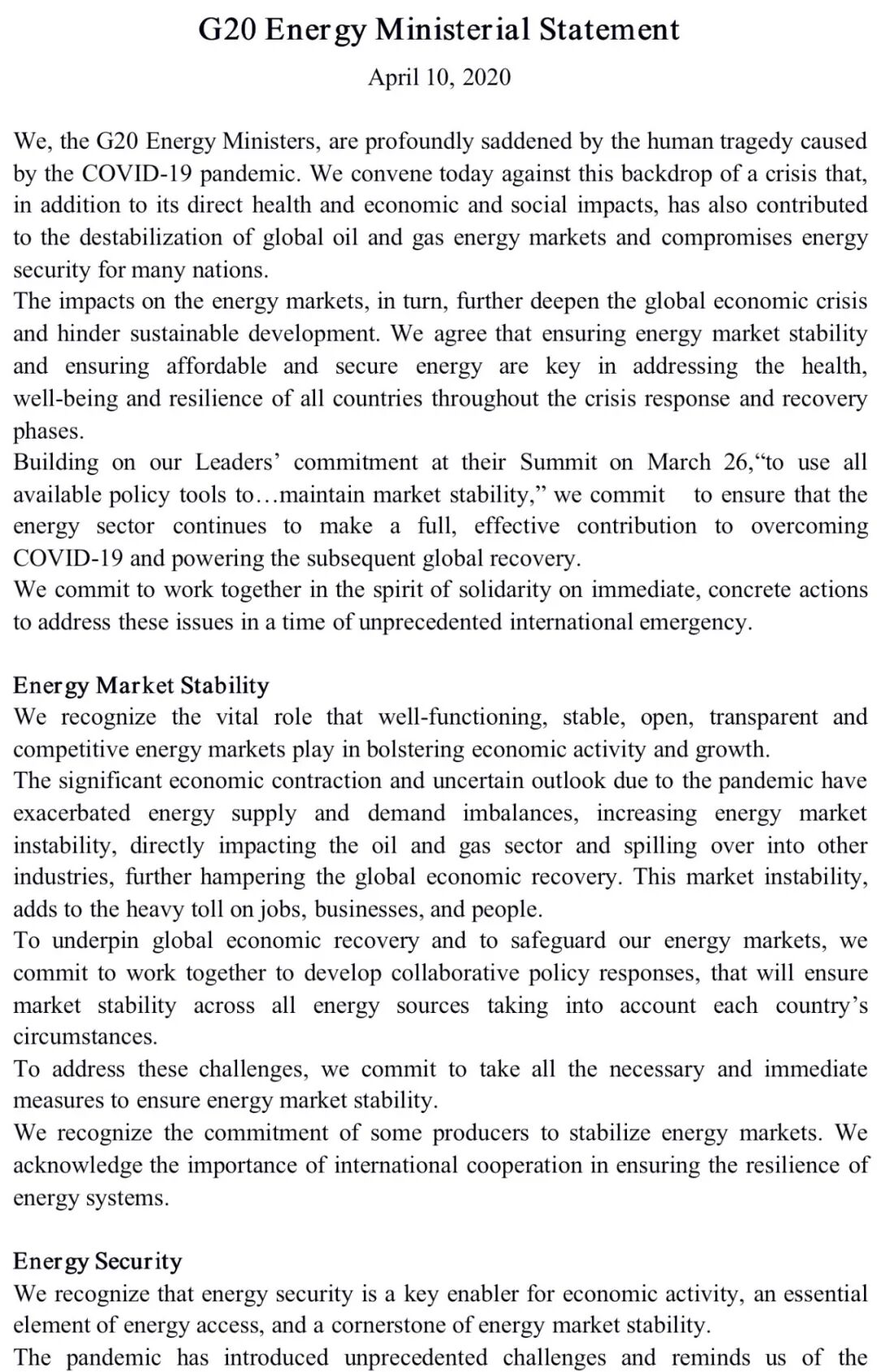新冠肺炎疫情导致了大规模的经济收缩和经济前景的不确定性,激化了能源供需失衡,从而加剧能源市场的不稳定,直接影响了油气行业并蔓延到其他行业,进一步阻碍全球增长。这种市场不稳定性给就业、商业和人民本身增添了重大损失。为支持全球经济复苏并维护能源市场,我们承诺考虑各国情况,共同制定协作性的政策应对措施,以确保各种能源的市场稳定。为应对这些挑战,我们承诺采取所有即时、必要的措施,以确保能源市场的稳定。我们认识到部分生产国作出致力于稳定能源市场的承诺。我们承认国际合作对保障能源系统韧性的重要性。能源安全